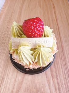 ホワイトショコラムースに爽やかなフランボワーズムースとピスタチオの生地をいれました。